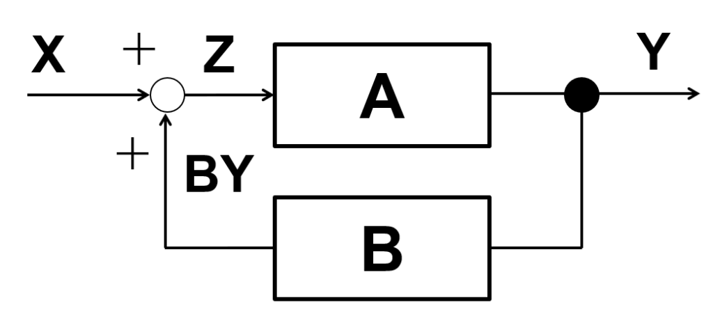 まず、入力Xの後に加え合わせ点があり,その後要素Aと引き出し点(黒丸)があり、出力Yがあります。