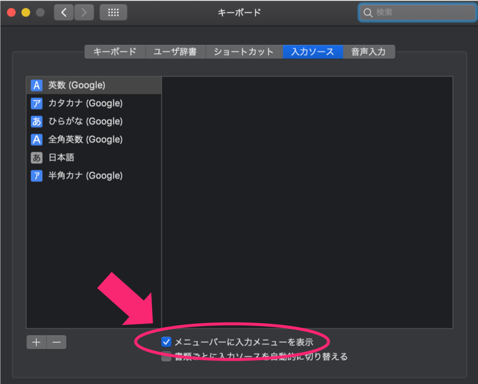 もしも入力メニューがステータスバーに無ければシステム環境設定のキーボードを選択し,