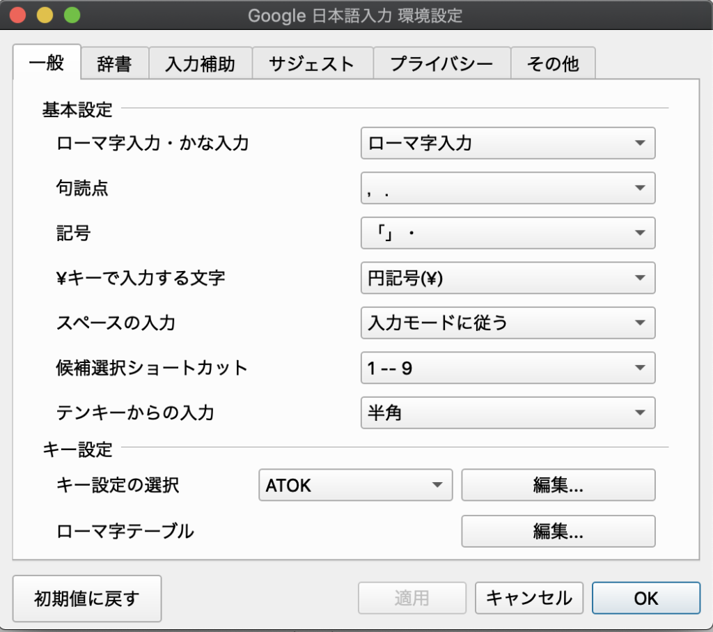 「一般」「辞書」「入力補助」「サジェスト」「プライバシー」「その他」があります.