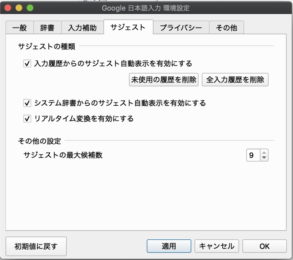 そのサジェストの設定ですが,環境設定の「サジェスト」のタブに移ると設定が可能になります.設定画面は以下のようになります.