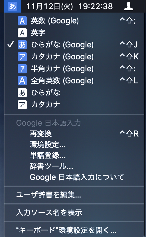 ステータスメニューに「A」や「あ」と表示されている入力メニューがあります.クリックすると以下のような画面となります.